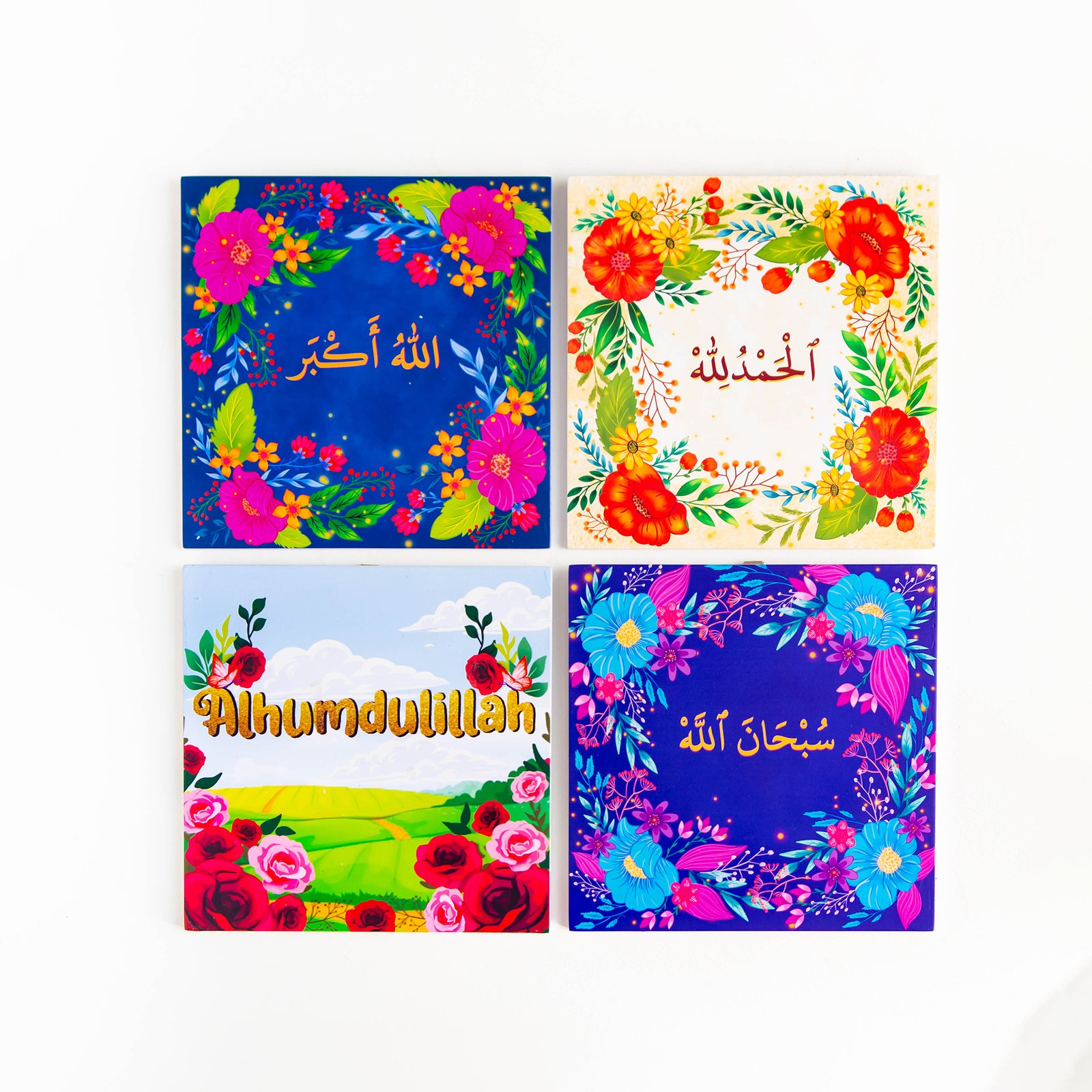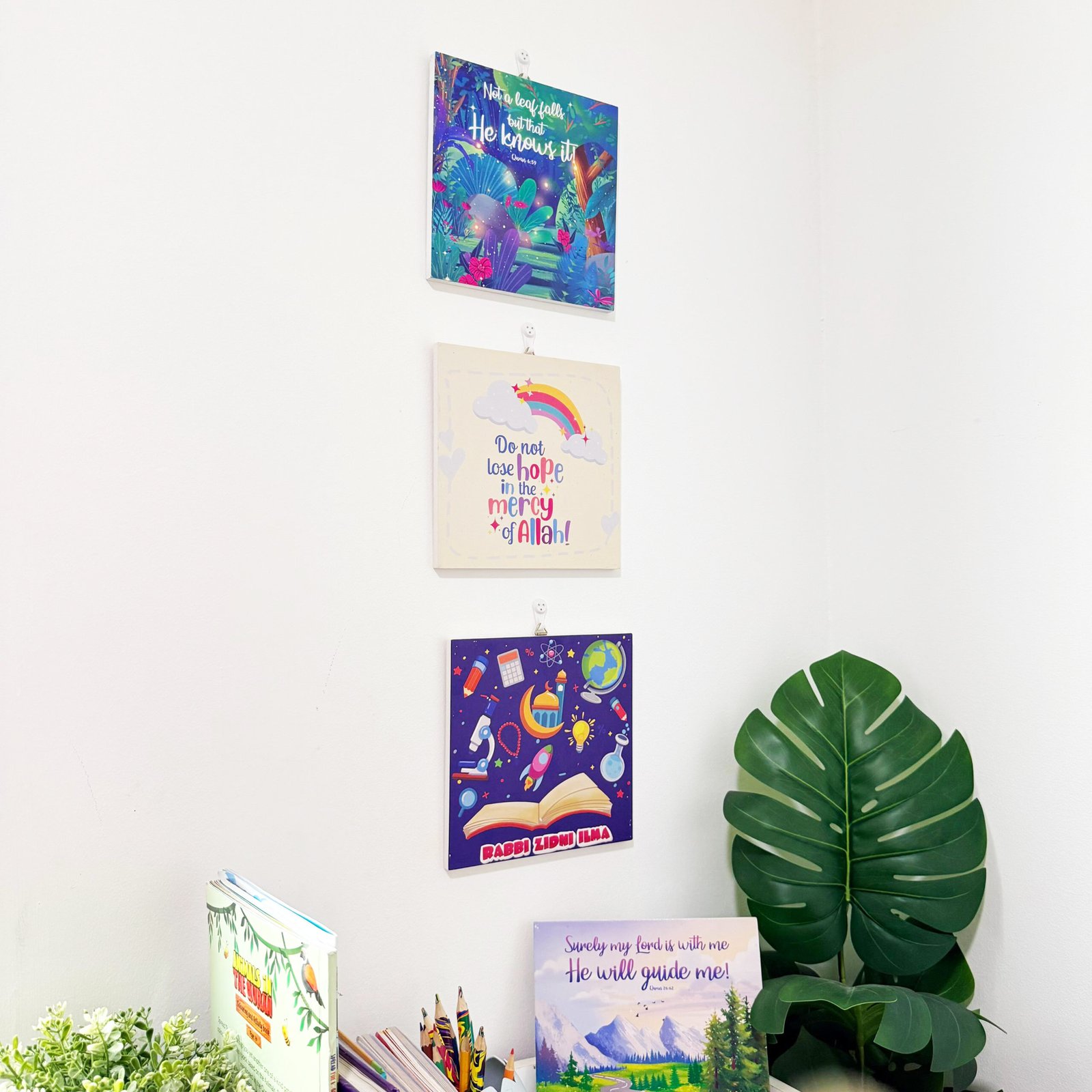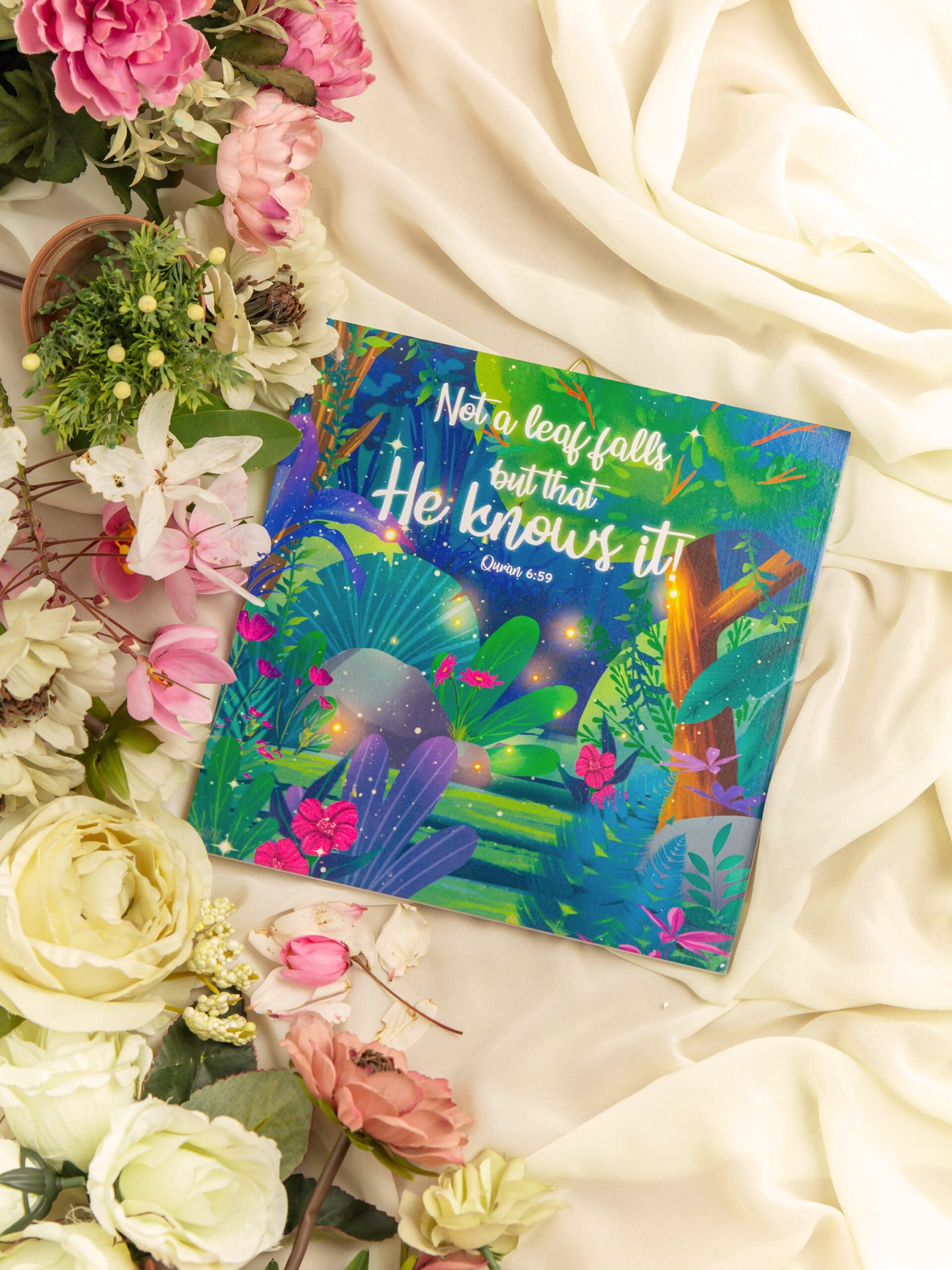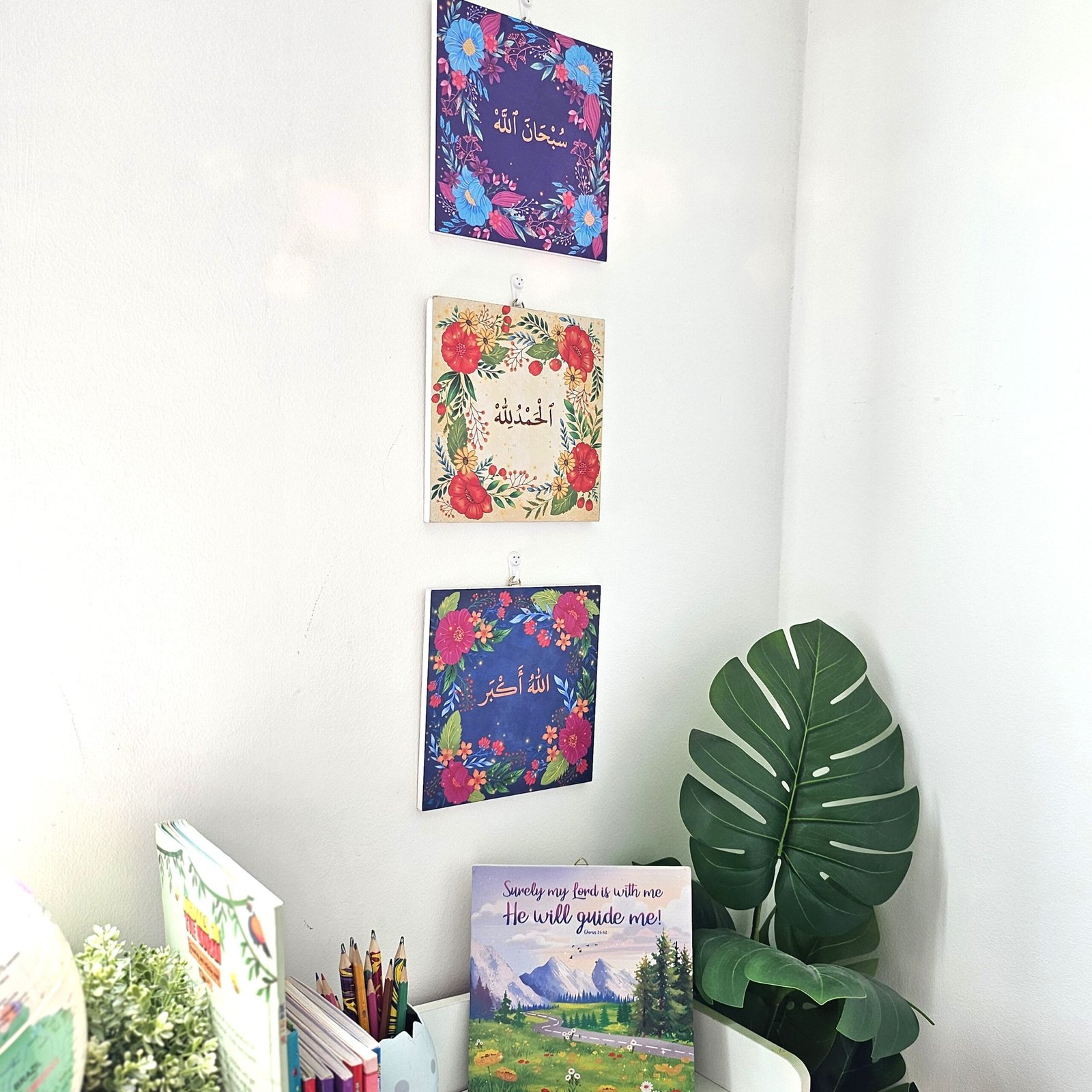 Not a leaf falls, Surely my Lord, Donot lose hope, Nur in my heart, Alhamduillah (English), Rabbi Zidni Ilma, SubhanAllah, Alhamduillah (Arabic), Allahu Akbar